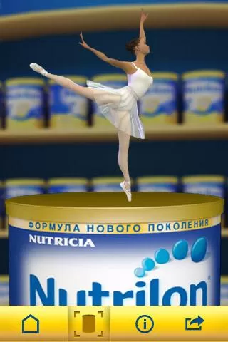 Дополненная реальность – это технология, которая позволяет увидеть на привычном фоне (дома, комнаты, магазина и пр.) непривычные предметы. Например, с приложением «Nutrilon-Прогресс» обычная упаковка детской смеси Nutrilon вдруг становится сценой, на которой танцует девочка, ставшая балериной, всем хорошо знакомая по рекламным материалам. Движения героини приложения были срисованы с настоящего танца балерины.