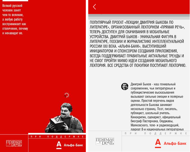 Популярный проект «Лекции Дмитрия Быкова по литературе», организованный лекторием «Прямая Речь», стал доступен для скачивания на мобильные устройства. Спонсором проекта стал «Альфа-Банк»