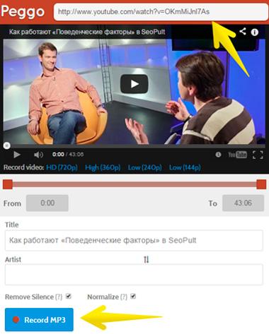 Специально для тех, кто не хочет тратить время, пялясь часами в монитор, и предпочитает слушать обучающие материалы в дороге, хочу рассказать о том, как можно вытащить аудио из видео на Youtube. Делается это очень просто: заходим на страницу с видео, копируем ссылку, заходим на сервис Peggo, вставляем ее туда и жмем “Record MP3”.