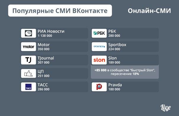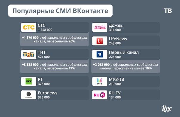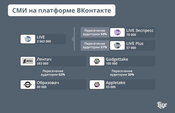 Новостной проект LIVE Plus, запущенный «ВКонтакте» на собственной платформе, назвал самые популярные СМИ в соцсети