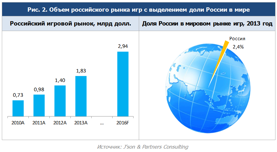 Объем игрового рынка в России составил 1,8 млрд долларов в 2013 году, увеличившись на 31% по сравнению с прошлогодними результатами, согласно оценкам J’son & Partners Consulting. Доля российского рынка игр в мировом рынке составила 2,4% в 2013 году. По прогнозам J’son & Partners Consulting, российский игровой рынок к 2016 году будет оцениваться в 2,94 млрд долларов.