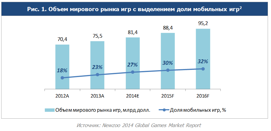 Мобильные игры составляли 23% общего рынка игр в 2013 году, а к 2016 году мобильные игры будут аккумулировать более 30% совокупной выручки игрового рынка. На данный показатель влияет рост проникновения мобильных устройств, а также более активное потребление игр пользователями.