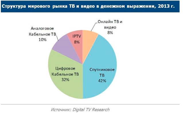 Сегмент онлайн-видео мирового рынка цифрового контента в 2013 году занимал 15%. В ближайшие три года онлайн-видео будет стремительно развиваться и в 2016 году достигнет 18% рынка цифрового контента. По данным Digital TV Research мировой рынок онлайн-видео составил 15,9 млрд долларов в 2013 году, а к 2016 он будет оцениваться в 25,5 млрд долларов. Доля сегмента онлайн-ТВ и видео составила 8% от мирового рынка видео в 2013 году. Стоит отметить, что доля данного сегмента растет, в то время как доля платного ТВ в мире снижается – с 98% в 2010 году до 92% в 2013 году.