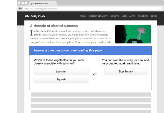 Все больше и больше сайтов делают платный доступ к своему контенту. И в первую очередь в качестве примера подобного подхода на ум приходит Wall Street Journal. Google Consumer Surveys – то же самое, что и платный доступ: система не позволяет пользователям увидеть контент. Однако единственная преграда, которую им надо преодолеть, – несколько небольших опросов.