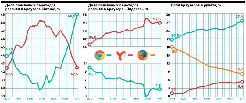 Но сейчас браузер номер один в России – это принадлежащий конкуренту «Яндекса» Google Chrome. Ему, по данным LiveInternet, в ноябре 2014 года принадлежало 27% рынка. На втором месте – Firefox с 7,9% и только на третьем – запущенный в 2012 году «Яндекс.Браузер» с 7%.