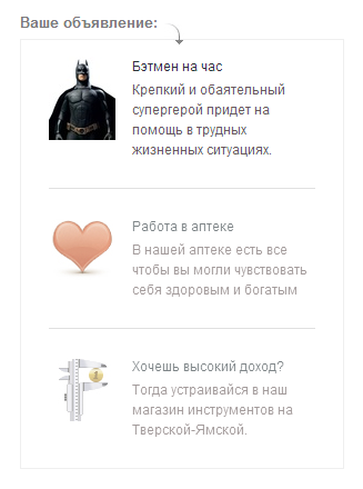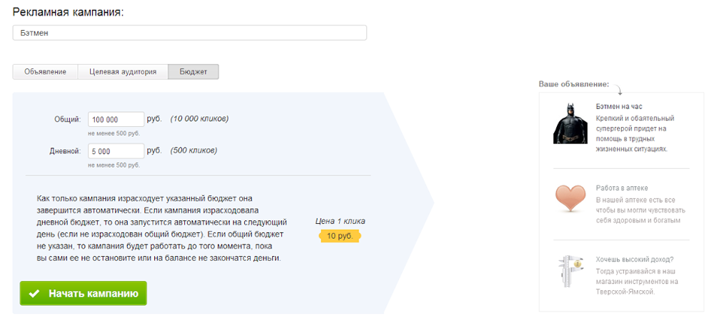 Объявления в системе Clickme состоят из текстового блока в 90 символов, заголовка в 25 символов и статичного изображения размером 90x90 пикселей. Они располагаются на форме поиска вакансий, страницах вакансий и компаний, а также в личном кабинете пользователей. Один клик на объявление, размещенное в Москве, обойдется в 20 рублей, по другим регионам – 10 рублей. Например, 10 000 кликов по объявлению, размещенному на специалистов по информационным технологиям и маркетологов Санкт-Петербурга с доходом от 50 тыс. рублей и хорошим знанием английского языка обойдутся в 100 тыс. рублей. Минимальный бюджет рекламной кампании в Clickme – 2 750 рублей.