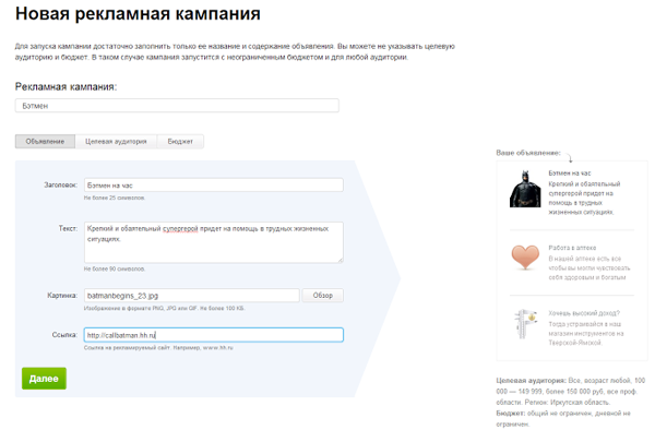 С Clickme любой клиент HeadHunter может самостоятельно разместить рекламное объявление на hh.ru, career.ru и rabota.mail.ru, указав таргетинг по региону, профессии, доходу, полу, возрасту и знанию иностранных языков интересной ему аудитории