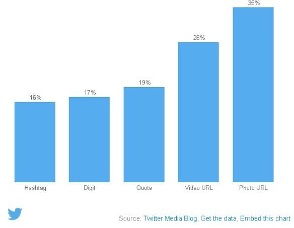 Так, твитами, содержащими изображения, пользователи делятся на 35% чаще, чем твитами, в которых присутствует только текст. Что же касается твитов, содержащих ссылки на видео, то ими пользователи делятся на 28% чаще.