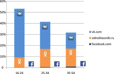 Интернет-пользователи от 16 до 24 лет более половины всего своего времяпровождения в Интернете отдают «ВКонтакте», немногим более 20% - «Одноклассники» и не более 15% остается на Facebook.