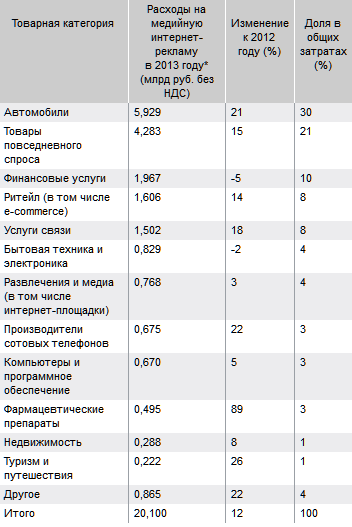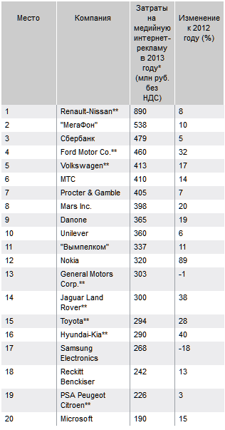 В целом затраты на медийную интернет-рекламу в 2013 году увеличились, по версии Ассоциации коммуникационных агентств России, на 12%, до 20,1 млрд руб. без НДС. Двадцать крупнейших рекламодателей в этом сегменте, по подсчетам Vizeum, потратили за год почти 7,5 млрд руб. То есть они обеспечили 37% всех доходов интернет-площадок в этом сегменте.