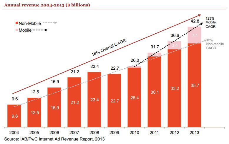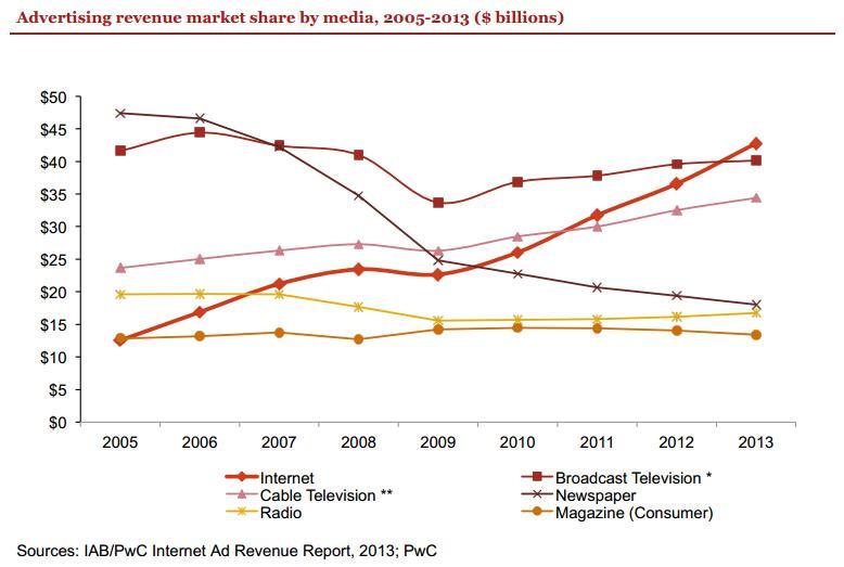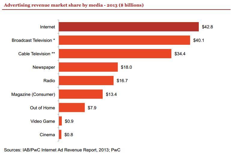 Объем рынка интернет-рекламы США в 2013 году вырос на 17% и достиг $42,8 млрд, на $2,7 млрд больше, чем заработало на рекламе эфирное телевидение