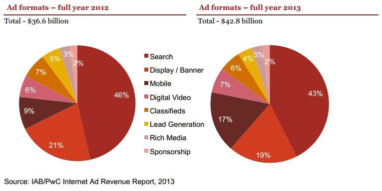 Постепенно меняется и структуры рынка интернет-рекламы по форматам. Поисковая и баннерная реклама постепенно уступает рекламе в приложениях для мобильных устройств и видеороликам. В абсолютном выражении при этом рост наблюдается везде. Доходы от баннеров и видео выросли на 7% ($12,8 млрд), от поисковой – на 9% ($18,36 млрд). Мобильная реклама в абсолютном выражении выросла почти в три раза – до $7 млрд.