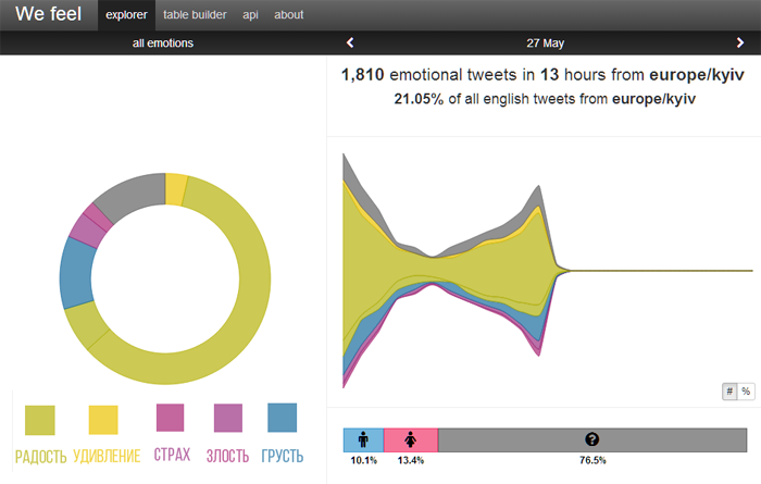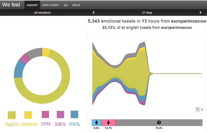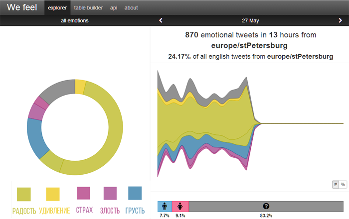 Психологи из Государственного объединения научных и прикладных исследований (CSIRO) и института Black Dog в Австралии при помощи сервиса микроблогов Twitter создали интерактивную карту эмоций We Feel (Мы чувствуем)