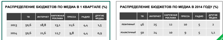 MEC Pulse также предложил два сценария развития рекламного рынка в 2014 году. По реалистичному сценарию, рынок покажет рост в 4% и достигнет показателя 341 млрд рублей. Оптимистичный сценарий предусматривает рост объема рынка до 350 млрд рублей. Если говорить о распределении бюджетов по реалистичному сценарию, то телереклама займет 50% бюджетов, интернет – 24%, наружка – 10%, пресса – 9% и радио – 5%. Оптимистичный сценарий несколько отличается: в нем ТВ занимает 46%, интернет – 25%, наружная реклама – 12%, пресса – 10%, реклама на радио занимает те же 5%.