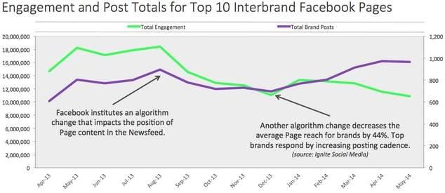 Учитывая увеличение числа постов, аналитики Simply Measured подсчитали средний показатель вовлеченности публикации брендов. Авторы отчета считают, что падение вовлеченности поста на Facebook-страницах брендов 50,4% вынуждают крупные компании уделять больше внимания качеству контента, а также тратить больше денег на рекламу.
