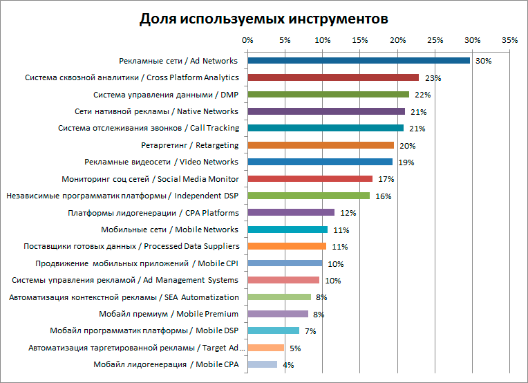 В этом году AdIndex рассмотрел 19 видов digital-инструментов. Они были поделены по четырем задачам: