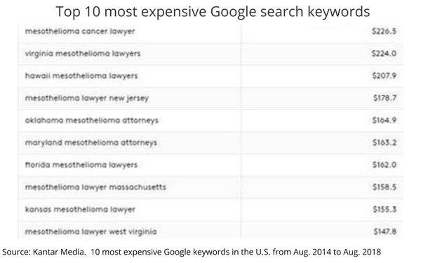 Kantar Media провело исследование и выяснило, что среди десяти наиболее дорогих ключевых слов в США первое место занимает «мезотелиома» и связанные с ней сочетания, пишет Media Post. Из топ-10 ключевых слов поиска Google все включали слова «мезотелиома», «юридическая фирма» и «адвокат»; в компании отмечают, что эта тенденция сохраняется уже на протяжении почти десяти лет.