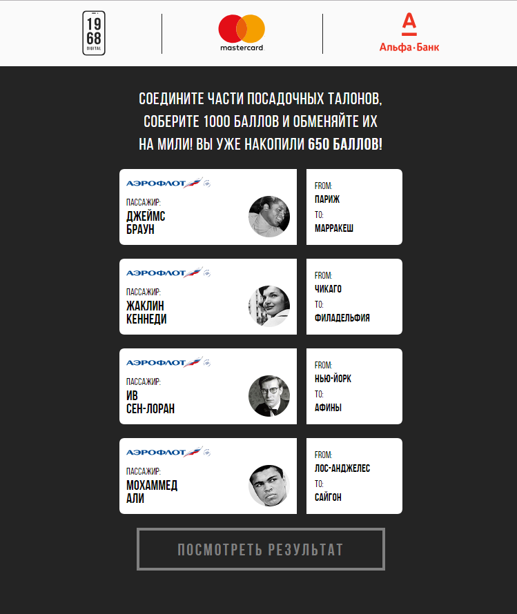 Механика довольно проста: нужно соединить части посадочных талонов Элизабет Тейлор, Арнольда Шварцнегера, Джими Хендрикса и других. За это можно получить мили. Акция продвигает банковскую карту «Альфа-банка» и «Аэрофлота» World Mastercard Black Edition, покупки по которой дают бонусные мили, которые можно потратить на полеты с 19 авиакомпаниями из альянса SkyTeam.