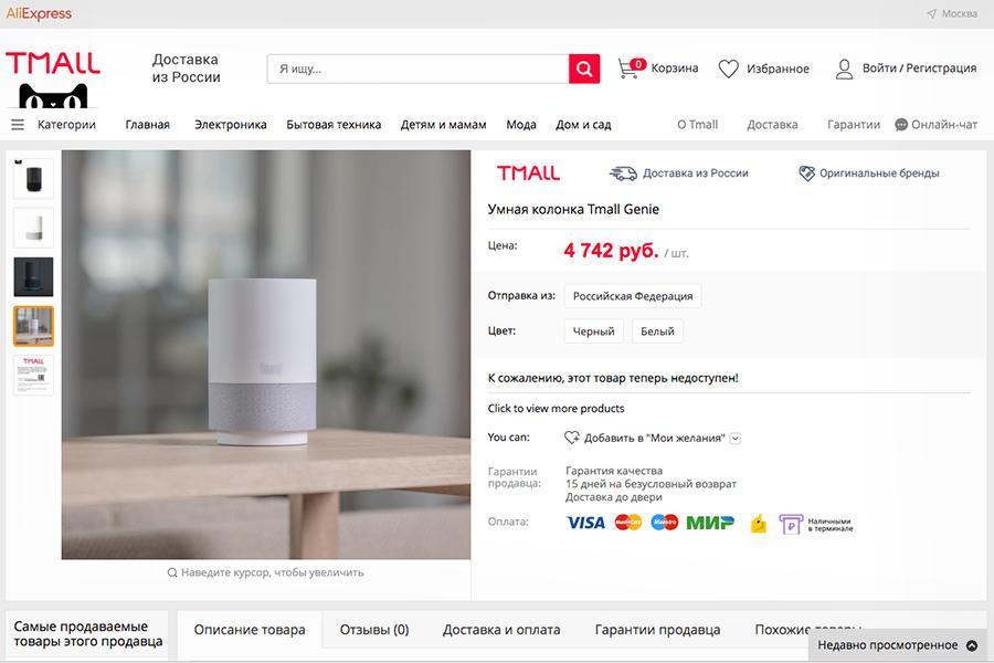 На сайте маркетплейса Tmall, который входит в Alibaba Group появились объявления с продажами умной колонки. Устройство распознает речь на китайском, английском и русском языках. С помощью колонки можно искать информацию в интернете голосовым управлением, слушать музыку, управлять функционалом «умного дома» и заказывать товары на Tmall, говорится в описании.