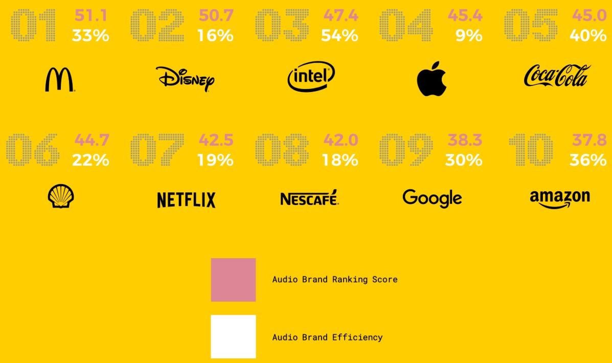 Первое место разделили McDonald's и Disney — они набрали по 51 из 100 баллов. Следом в рейтинге расположились Intel, Apple и Coca-Cola. Замкнули десятку Shell, Netflix, Nescafé, Google и Amazon. Последние показали хорошие результаты благодаря своим голосовым помощникам. Чтобы оценить компании, агентство использовало ряд критериев, среди которых доверие, признание, вовлеченность и эффективность. Несмотря на растущий ассортимент цифровых платформ Spotify, Facebook, Huawei, Honda, Adobe и Visa стали наименее узнаваемыми аудиобрендами.