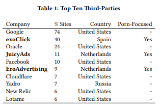 Эксперты компании проанализировали более 20 тыс. сайтов для взрослых. Выяснилось, что 93% из них предоставляют данные о своих пользователях третьим лицам. Google следит за 74% посетителей рассмотренных порносайтов, Oracle — за 24%, Facebook — за 10%.