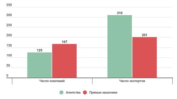 1. Доля сотрудничества характеризует положение агентств на рынке относительно конкурентов. Рассчитывалась как процент компаний-заказчиков, работающих с агентством в указанном сегменте, от общего числа опрошенных компаний, работающих в сегменте.
