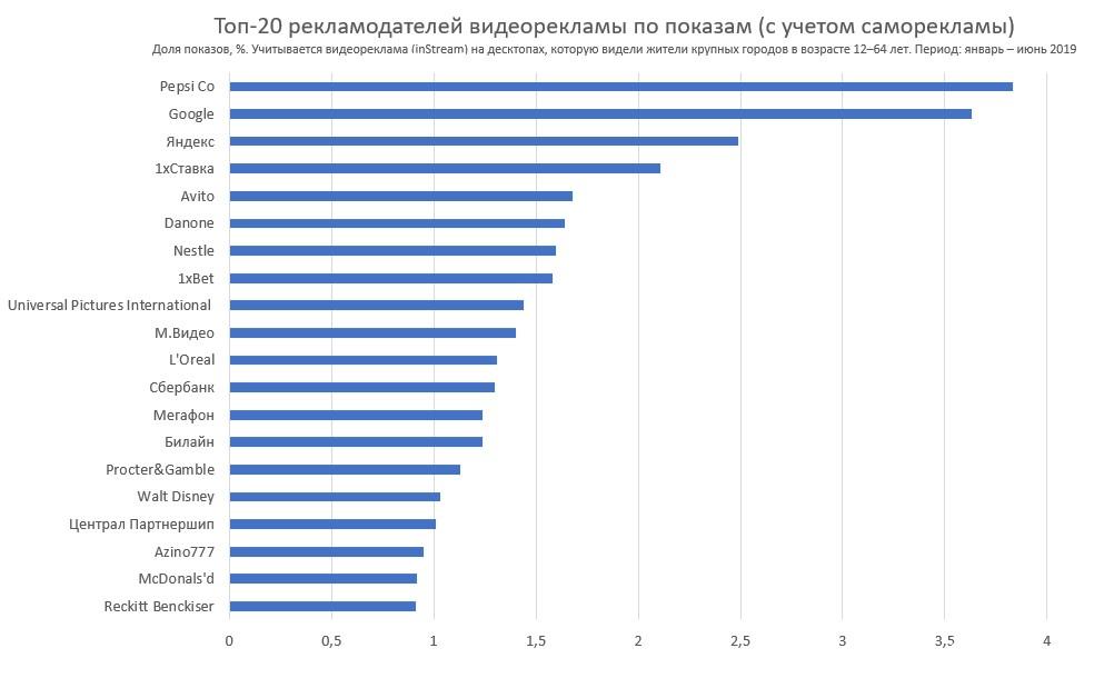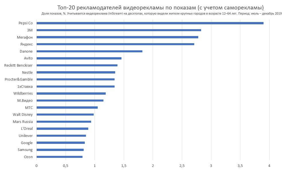 За год заметно изменилась и первая пятерка рекламодателей: из нее выпали Google, «1хСтавка» и Avito. Лидером по доле показов остается PepsiCo (3,9%), на второе место вышла многопрофильная производственная компания 3М (владелец брендов Scotch, Command, Cubitron, Opticlude), а на третье — «МегаФон». «Яндекс» опустился с 3-го на 4-е место, тогда как Danone поднялся с 6-го на 5-е.