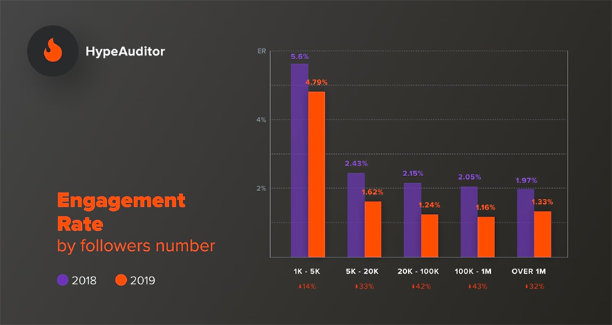 Больше всего пострадали от изменений мегаинфлюенсеры и знаменитости. ER упал всего на 14% у блогеров с 1–5 тыс. подписчиков, на 33% — у блогеров с 5–20 тыс. человек, на 42% — 20–100 тыс., на 43% — от 100 тыс. до 1 млн, на 32% — у тех, кто имеет более 1 млн подписчиков.