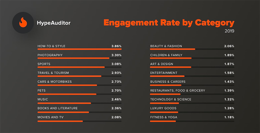 Если говорить о тематике блога, то наибольшее ER было у тех, кто пишет о стиле (3,86%), фотографии (3,30%) и спорте (3,08%).