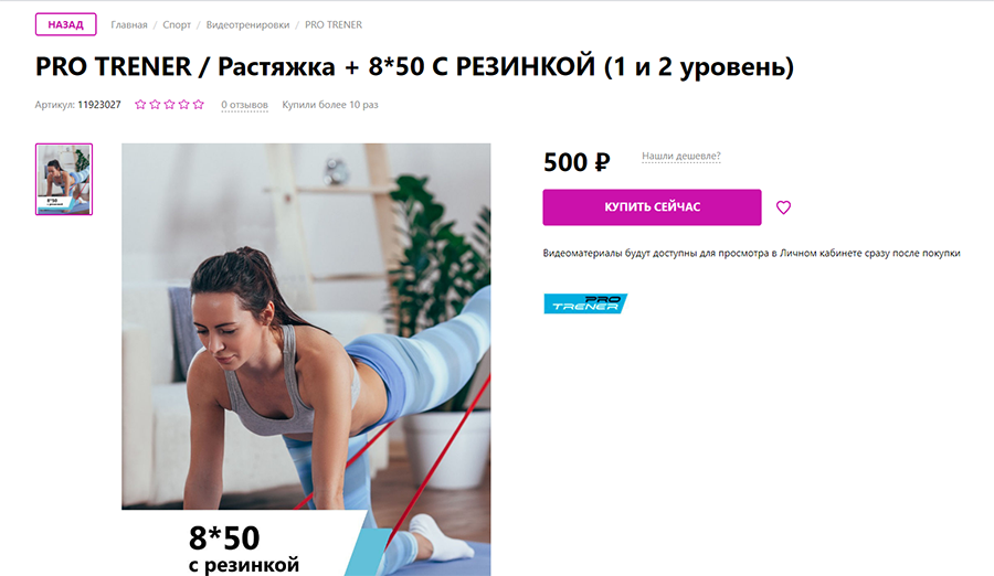 В разделе спорта размещено шесть видеоуроков с персональными тренировками от студии Pro Trener. Как говорится в описании к урокам, после покупки ролики должны открываться в личном кабинете. Стоимость одного курса составляет 500 руб.