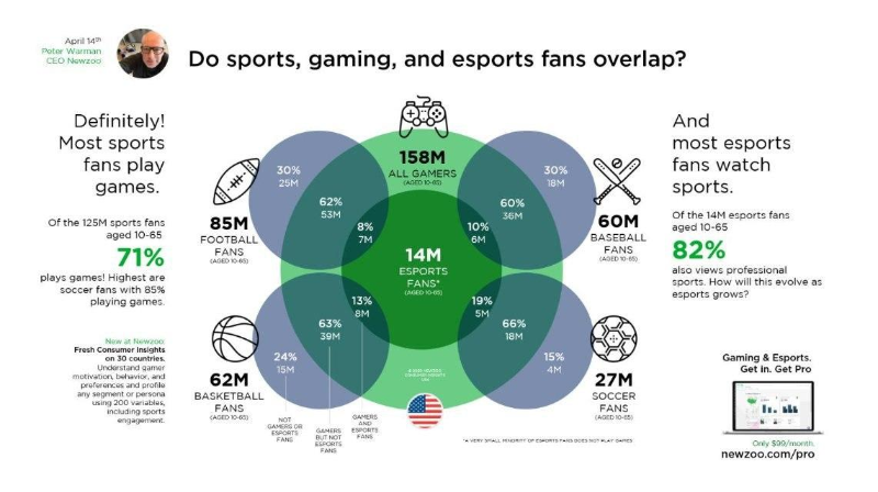 Интересные цифры относительно пересечения аудитории спортивных и киберспортивных мероприятий в США приводит исследовательская компания NewZoo. Более 70% спортивных фанатов в возрасте от 10 до 65 лет играют в компьютерные игры. Причем среди любителей футбола процент геймеров наиболее высокий - 85%.