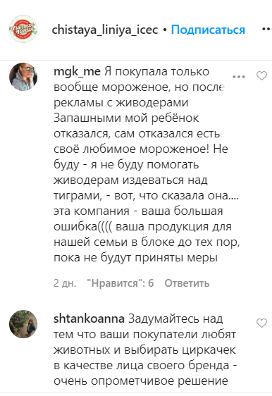 Подписчики компании в Instagram указали на то, что дрессировщики жестоко обращаются с животными. Из-за этого пользователи назвали Запашных неподходящими для рекламы детского продукта