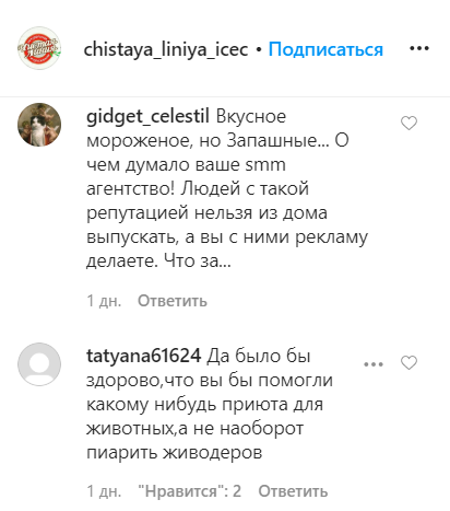 Реклама нового вкуса производителя мороженого «Чистая линия» подверглась критике со стороны пользователей в Instagram. На негативные комментарии в официальном аккаунте бренда первым обратило внимание сообщество «Беспощадный пиарщик».