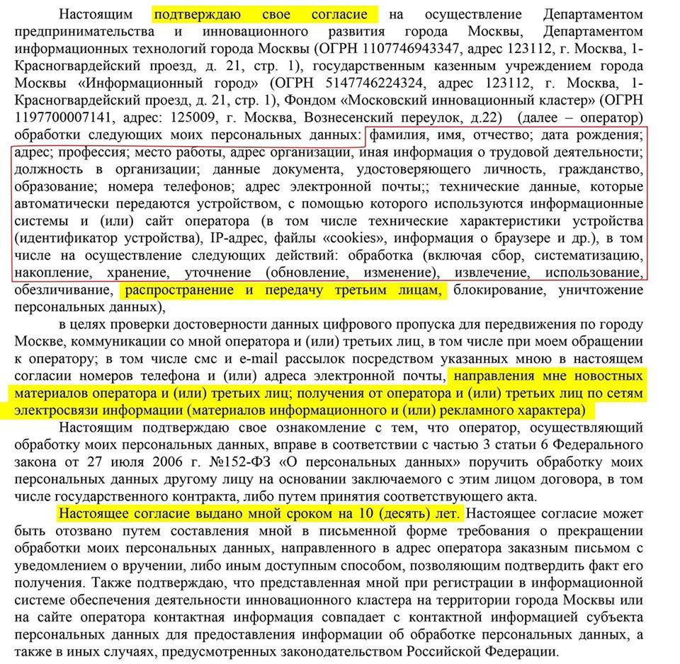 Такое условие содержится в договоре, с которым соглашается пользователь для проверки выданного ранее цифрового пропуска. Речь идет о следующих данных: ФИО, дата рождения, номер телефона, e-mail, адрес, профессия, место работы, адрес организации и пр. Эти данные могут быть использованы Департаментом предпринимательства и инновационного развития Москвы в том числе для рассылки информационных материалов и рекламы. Срок действия соглашения — 10 лет.