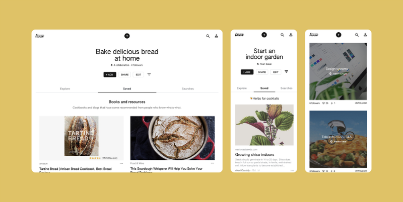 На платформе можно собирать коллекции контента и просматривать подборки, похожие на сохраненные материалы. Похожим образом работает Pinterest. Контентом можно будет делиться с другими пользователями.