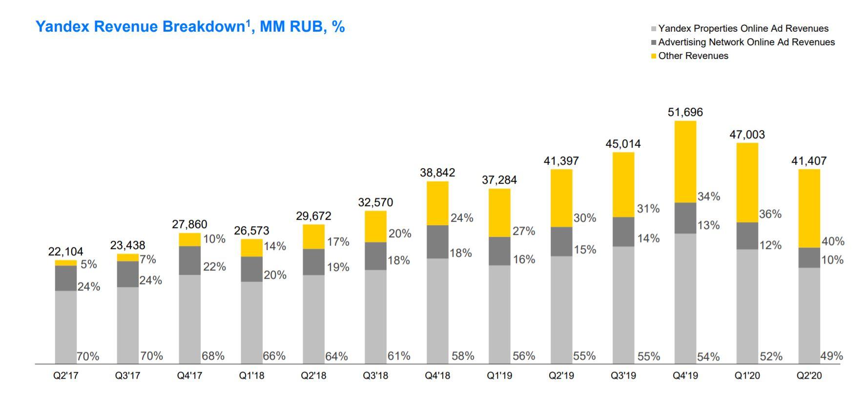 Выручка, относящаяся к сегменту «Такси», во втором квартале выросла на 42%. Такой результат в основном обусловлен ростом фудтех-направления, которое включает сервисы «Яндекс.Лавка» и «Яндекс.Еда», а также развитием сервиса «Яндекс.Такси» для бизнеса. Прочие доходы выросли на 21% и составили 10% от общей выручки. Годом ранее их доля составляла 30%. Динамика связана в основном с ростом доходов медиасервисов от продаж подписок, а также с проектами в области интернета вещей (Internet of Things, IoT) и ростом облачного бизнеса. Рост был частично нивелирован снижением доходов «Яндекс.Драйва» в связи с запретом на работу каршеринга в Москве и Санкт-Петербурге на протяжении почти всего второго квартала.
