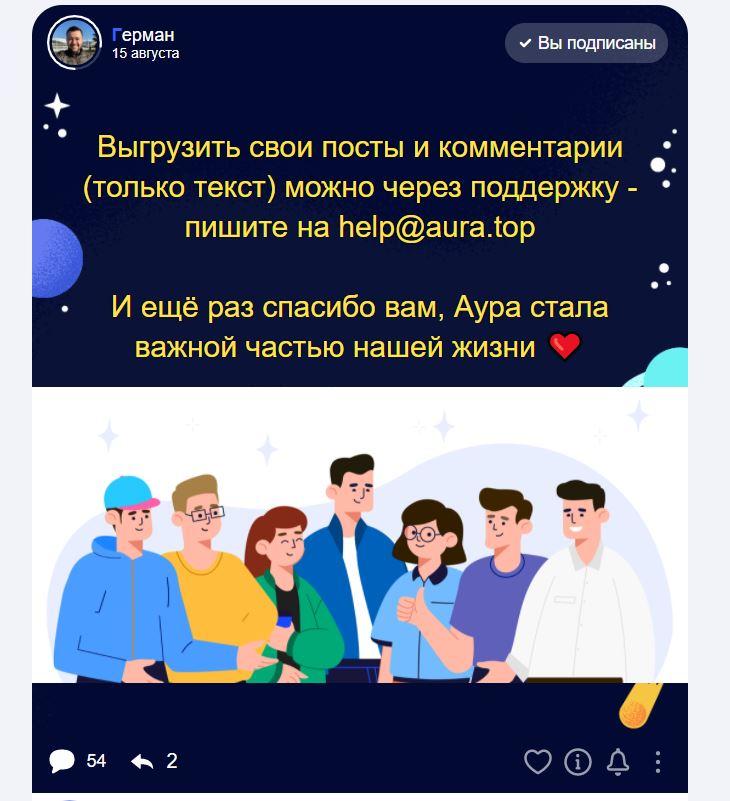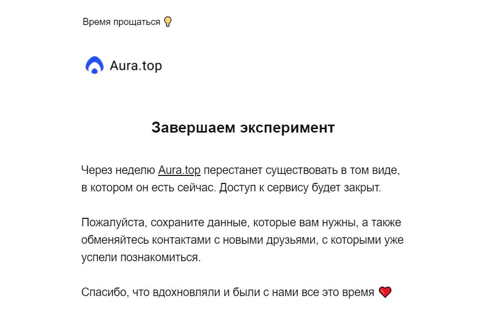 Проект «Аура», начинавшийся как эксперимент «Яндекса», объявил о своем закрытии. Пользователи социальной сети получили сообщение, что через неделю Aura.top «перестанет существовать в том виде, в котором он есть сейчас». Аудитории предложено сохранить нужные данные и обменяться контактами с друзьями