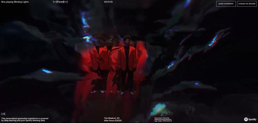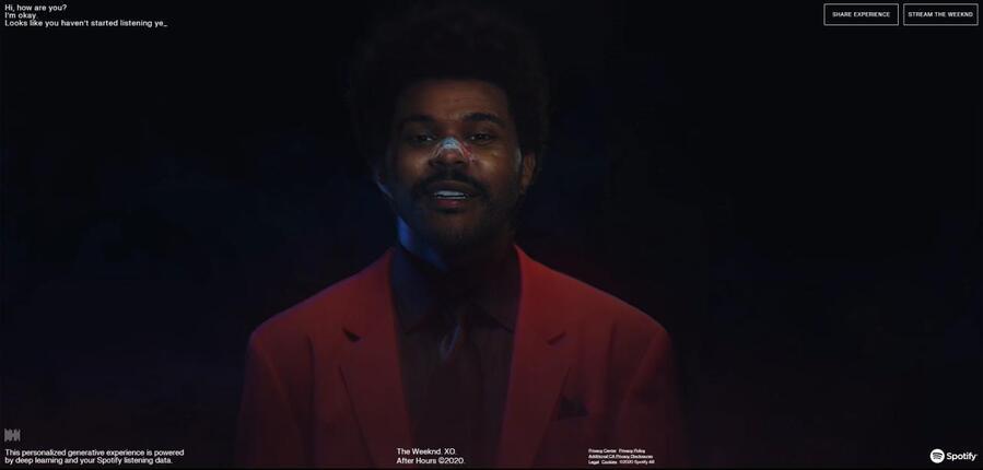 Для меломанов эта технология — персонализированный способ познакомиться с новым альбомом After Hours, вышедшим в марте. На сайте Alone With Me пользователь встречает цифрового клона The Weeknd, который обращается к пользователю по имени и, обнаруживая, что «собеседник» ничего не слушает в данный момент, предлагает познакомиться с его треками.