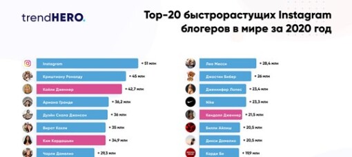 Сервис аналитики и работы с блогерами в Instagram trendHERO проанализировал больше 60 млн аккаунтов, чтобы понять, кто из блогеров набрал больше всего подписчиков за 2020 год и какие факторы на это повлияли