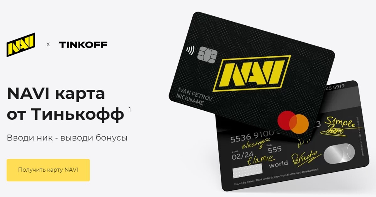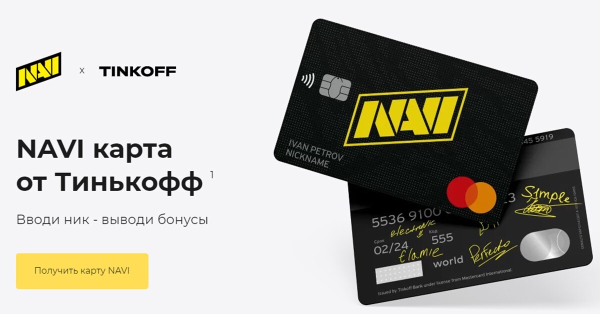 20 января 2021 г. на сайте navi.gg откроется специальный раздел, черезкоторый фанаты NAVI смогут заказать карту для геймеров NAVI — TinkoffMastercard в эксклюзивном дизайне клуба с игровым никнеймом держателя карты. Наобратной стороне карты будут изображены автографы игроков CS:GO-состава Егора‘Flamie’ Васильева, Александра ‘S1mple’ Костылева, Дениса ‘Electronic’Шарипова, Кирилла ‘Boombl4’ Михайлова и Ильи ‘Perfecto’ Залуцкого. Данныйдизайн пока доступен только для физических карт, но в будущем будет добавленаопция оформления брендированной виртуальной карты в Apple Pay.