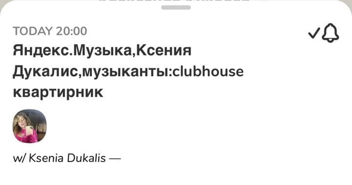 Стриминговый сервис «Яндекс.Музыка» запланировал в голосовой соцсетиClubhouse музыкальную«комнату» сегодня,17 февраля в 20:00. Участниками станут АИГЕЛ, Тося Чайкина, Сабрина, MashaHima, Кравц и KINA. Событие проведет блогер Ксения Дукалис.
