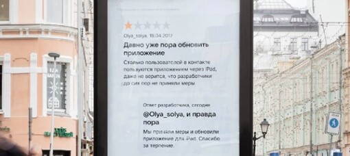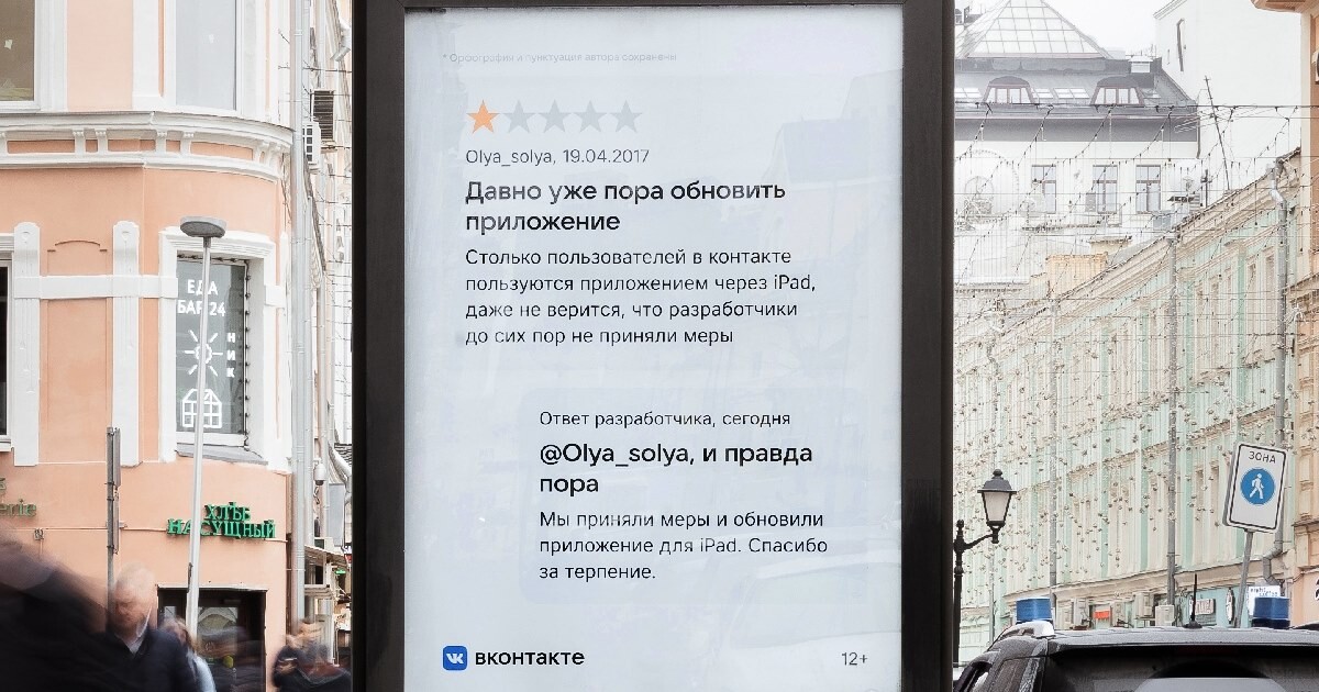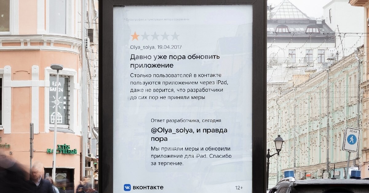 Двумя днями ранее в Москве, Санкт-Петербурге, Казани, Екатеринбурге и НижнемНовгороде появилась наружная реклама с отзывами четырехлетней давности. В нихпользователи жалуются на плохую работу приложения «ВКонтакте» для iPad иотсутствие обновлений. На билбордах изображены ответы разработчиков на жалобы.Акциюсочлинеудачной первоапрельской шуткой. Последнее серьезное обновление для iPadсоцсеть выпускала в 2015 г.