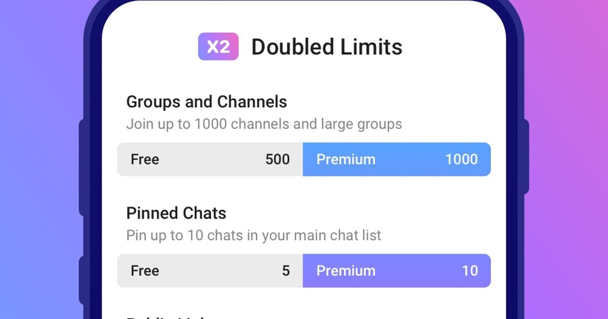 Премиальная подписка пока доступна только для владельцев телефоновiPhone. Она подразумевает полное отсутствие рекламы. Также включает в себяудвоенные лимиты, загрузку файлов до 4 Гб, более высокую скорость загрузки,конвертацию голосовых сообщений в текст. Также пользователи смогут отправлятьуникальные реакции, получат премиальные стикеры, у них появится расширенноеуправление диалогами.