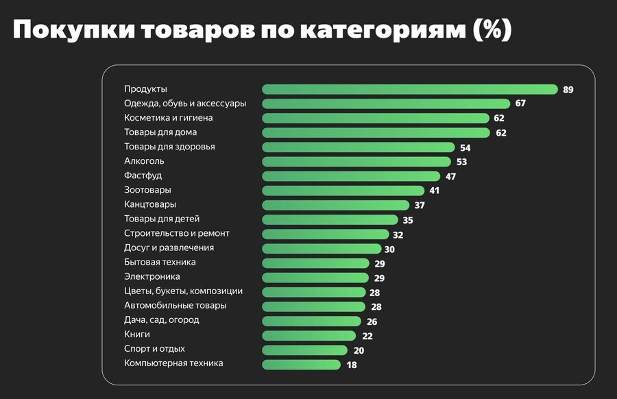 Также «Едадил» провел исследование потребительского поведения россиян.Продукты питания, одежда, обувь и аксессуары, а также косметика и гигиена сталисамыми покупаемыми категориями, по мнению респондентов.