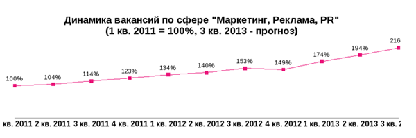 По данным HeadHunter, с начала 2011 года и по настоящее время открытых вакансий для маркетологов и рекламистов на hh.ru стало в 2 раза больше. Сейчас их около 22 тысяч по всей России.