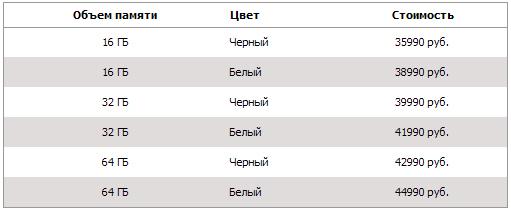 Например, стоимость модели iPhone 4S с 16 ГБ памяти в черном цвете составит 35990 руб., а если покупатель захочет приобрести устройство в белом цвете, то ему придется доплатить 3 тыс. руб. и отдать уже не 35990 руб., а 38990 руб. Аналогична ситуация с моделями с объемом памяти 32 и 64 ГБ за тем лишь исключением, что разница в цене составит 2 тыс. руб. Самая дорогая модель - iPhone 4S с 64 ГБ памяти в белом цвете - обойдется покупателю в 44990 руб. (на 2 тыс. руб. дороже, чем в черном корпусе).