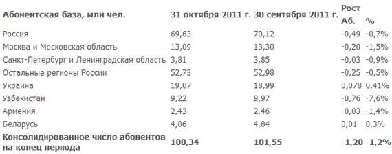 На конец октября 2011 года консолидированная абонентская база МТС составила 100,34 миллиона пользователей, против 101,55 млн месяцем ранее. «Уже несколько месяцев мы наблюдаем стабильный уровень и высокое качество текущих гросс-подключений, что обеспечивает реализацию стратегии МТС на развитие и удержание качественной абонентской базы, генерирующей компании стабильный рост выручки. Главным приоритетом МТС остается кропотливая и точечная работа с каждым клиентом компании. В дальнейших периодах мы ожидаем дополнительный позитивный эффект от завершенного в октябре перевода региональных дилеров в России на новый формат работы, который подразумевает отказ от выплаты бонусов по факту продажи SIM-карт в пользу вознаграждения, основанного на фактическом потреблении услуг связи новыми абонентами», - отметил вице-президент по продажам и обслуживанию МТС Вадим Савченко.