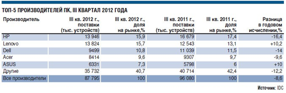Между тем обе исследовательские компании сошлись на том, что поставки ПК сократились более чем на 8% по сравнению с годом ранее (по оценке Garter — на 8,3%, IDC — на 8,6%). «Этот год выдастся непростым для производителей ПК, так как покупатели ждут официального запуска ОС Windows 8 от Microsoft. Еще один фактор риска — планшетники», — говорит аналитик Nomura Securities Ив Юнг, цитата Reuters.
