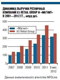 В ежемесячном рейтинге продуктовых торговых сетей эксперты InfoLine отмечают, что при сохранении текущих темпов роста «Магнита» в отрасли крайне вероятна смена лидера. В 2011 году разница в выручке между ним и Х5 составляла 116,8 млрд руб. в пользу последней. Однако уже по итогам третьего квартала 2012 года разрыв сократился до 4,2 млрд руб. За этот период выручка «Магнита» составила 111,7 млрд руб., а X5 — 115,9 млрд руб.