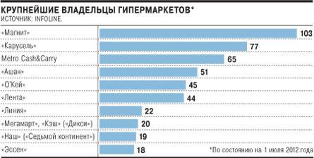 На июль 2012 года 'Ашан' располагал 51 гипермаркетом общей площадью 516,6 тыс. кв. м, 'О'Кей' развивал 45 подобных магазинов общей площадью 329,6 тыс. кв. м, а 'Лента' — 44 точками общей площадью 321 тыс. кв. м. При этом прошлогодняя выручка 'Ашана' с учетом всех своих форматов могла составить, по оценке X5 Retail Group, $6,9 млрд (доля рынка — 2,6%), 'О'Кей' — $3,1 млрд (1,2%), 'Лента' — $2,8 млрд (1%).